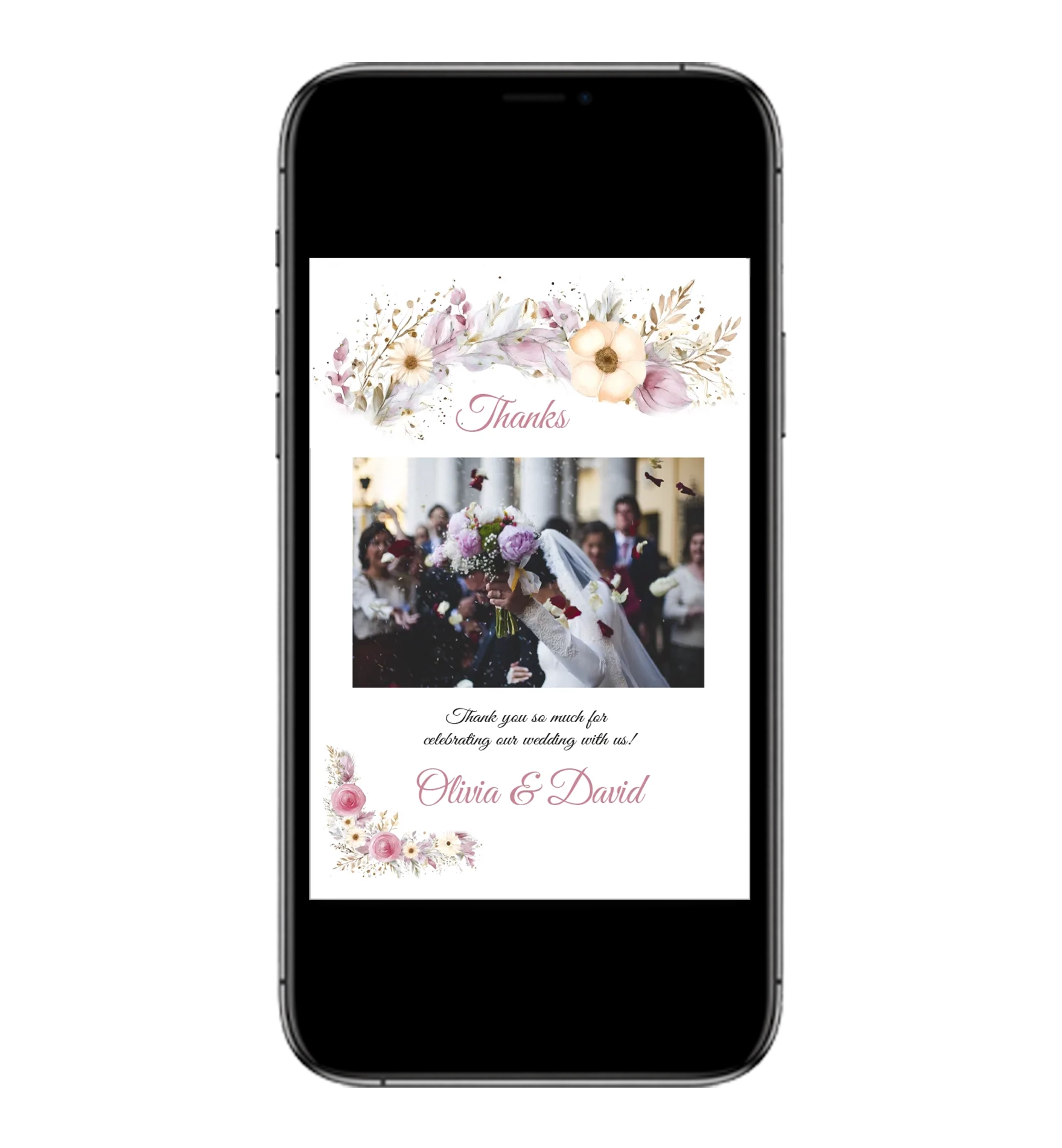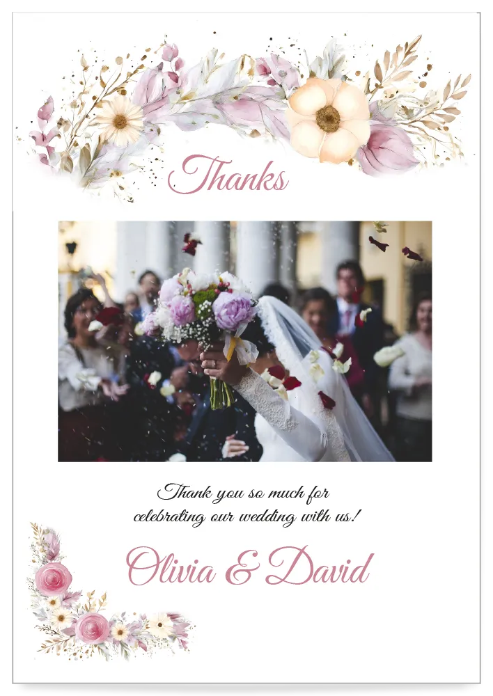Digital Thank You Card Floral Celebration pink design – perfect for summer weddings and romantic events. Delivered as a JPEG via email, ready to send by SMS or email. Fast, simple, and and postage-free!