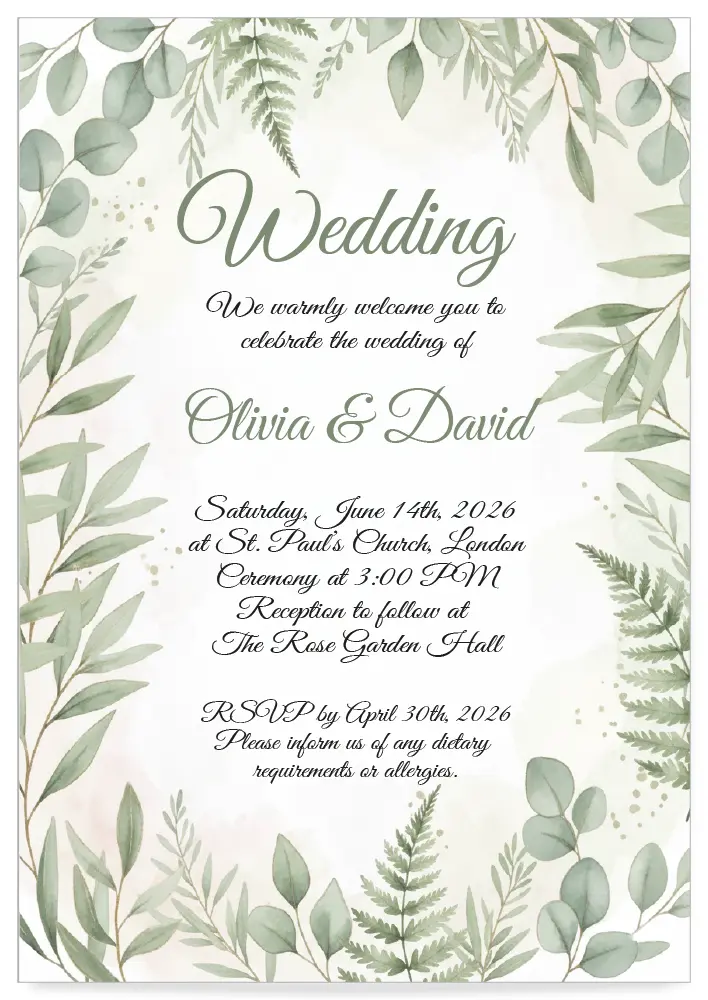 Give your guests a joyful preview of your special day with our stunning Digital Wedding invitation Card template Olive. Featuring a bright, blooming design, this digital invitation template is ideal for weddings, garden parties, and other romantic celebrations.