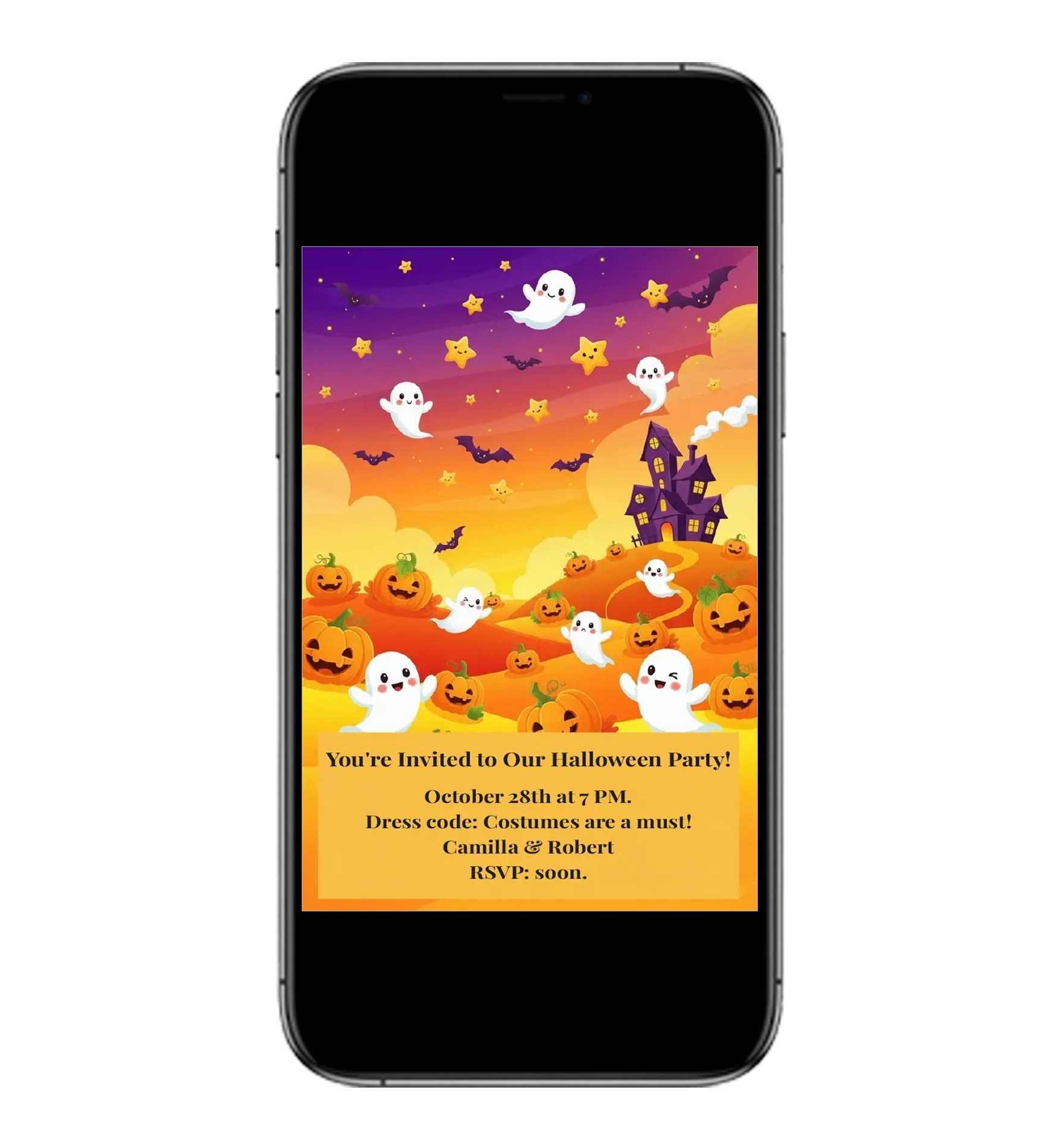 This modern digital halloween card beautifully encapsulates the joy of party and celebration. Share it effortlessly with all your guests to make a stunning first impression – all digitally.