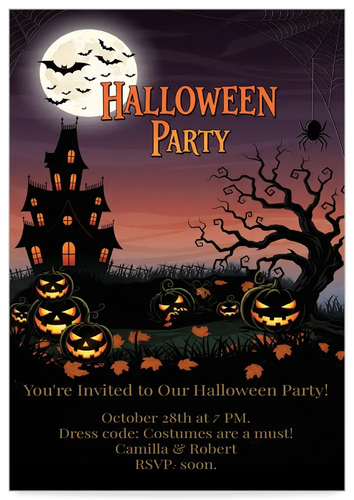 Give your guests a glimpse into a spook-tacular night! Our invitation template has a fun and playful design that’s perfect for luring all the monsters, witches, and vampires to your Halloween party.