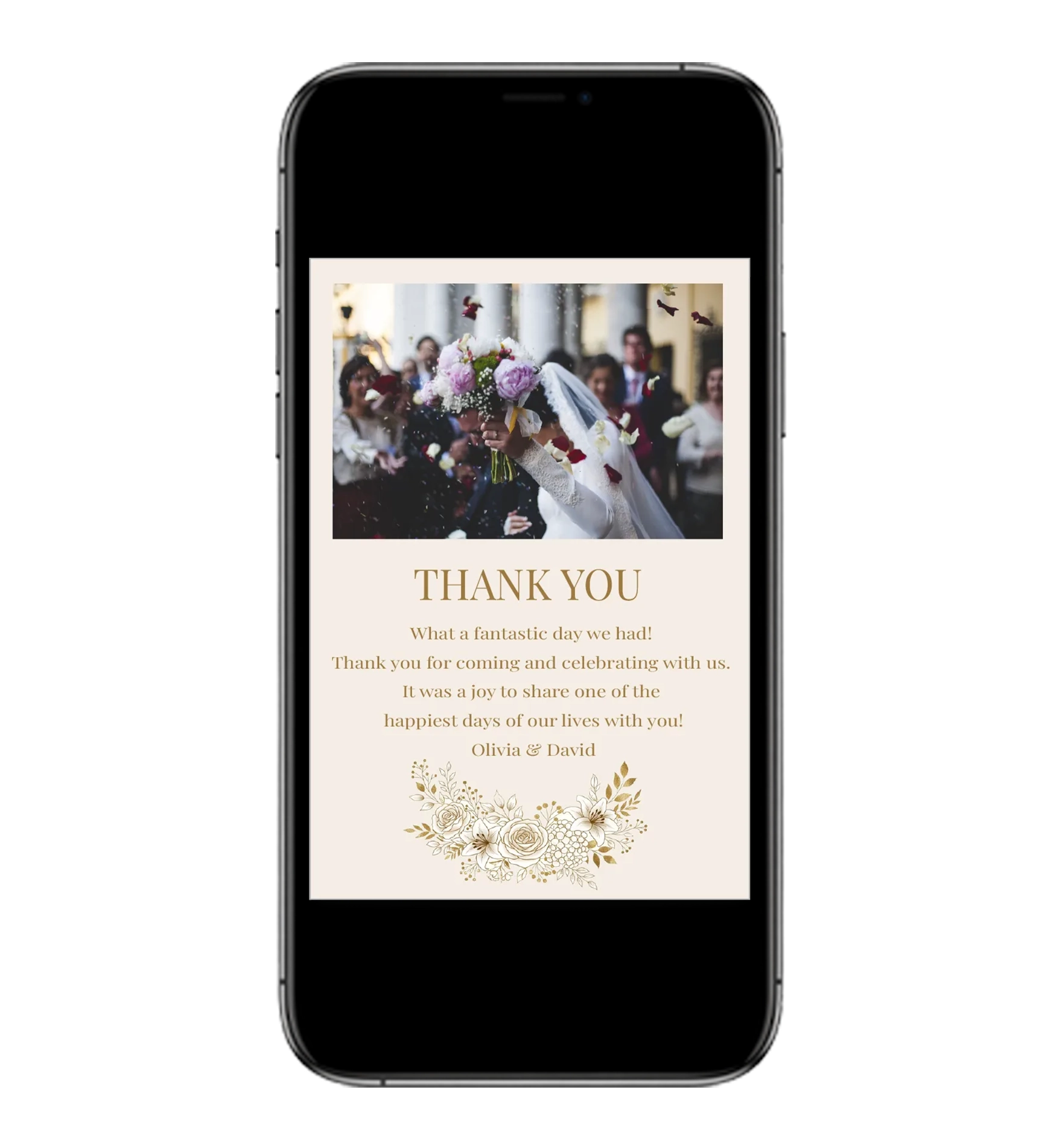 Digital Thank You Card template Cream design – perfect for summer weddings and romantic events. Delivered as a JPEG via email, ready to send by SMS or email. Fast, simple, and and postage-free!